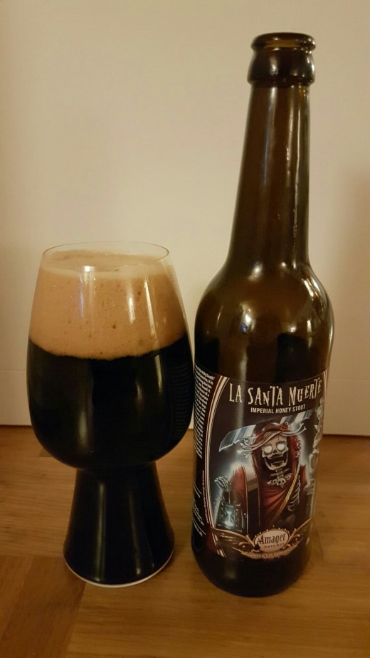 Endelig var jeg også en tur forbi den imperial honney stouten La Santa Muerte, som tidligere har været ude som fadøl, men er altså nu blevet valgt til at komme på flaske og det må jeg sige, at jeg synes er et rigtig fremragende valg. Kulsort og stærk. Ristet, men sød. Blød, men samtidig med kant. Kort sagt, så er jeg ret begejstret. Allerede i næsen er man ikke i tvivl om, at vi har med de klassiske ristede malte og chokoladenoter at gøre, ligesom honningen synes at kigge frem. I munden bakkes de nævnte indtryk op med noter af lakrids, inden vi slutter med en honningagtig sødme, der dog balanceres af humlebitterhed, så øllet ikke kammer over i sin sødme.