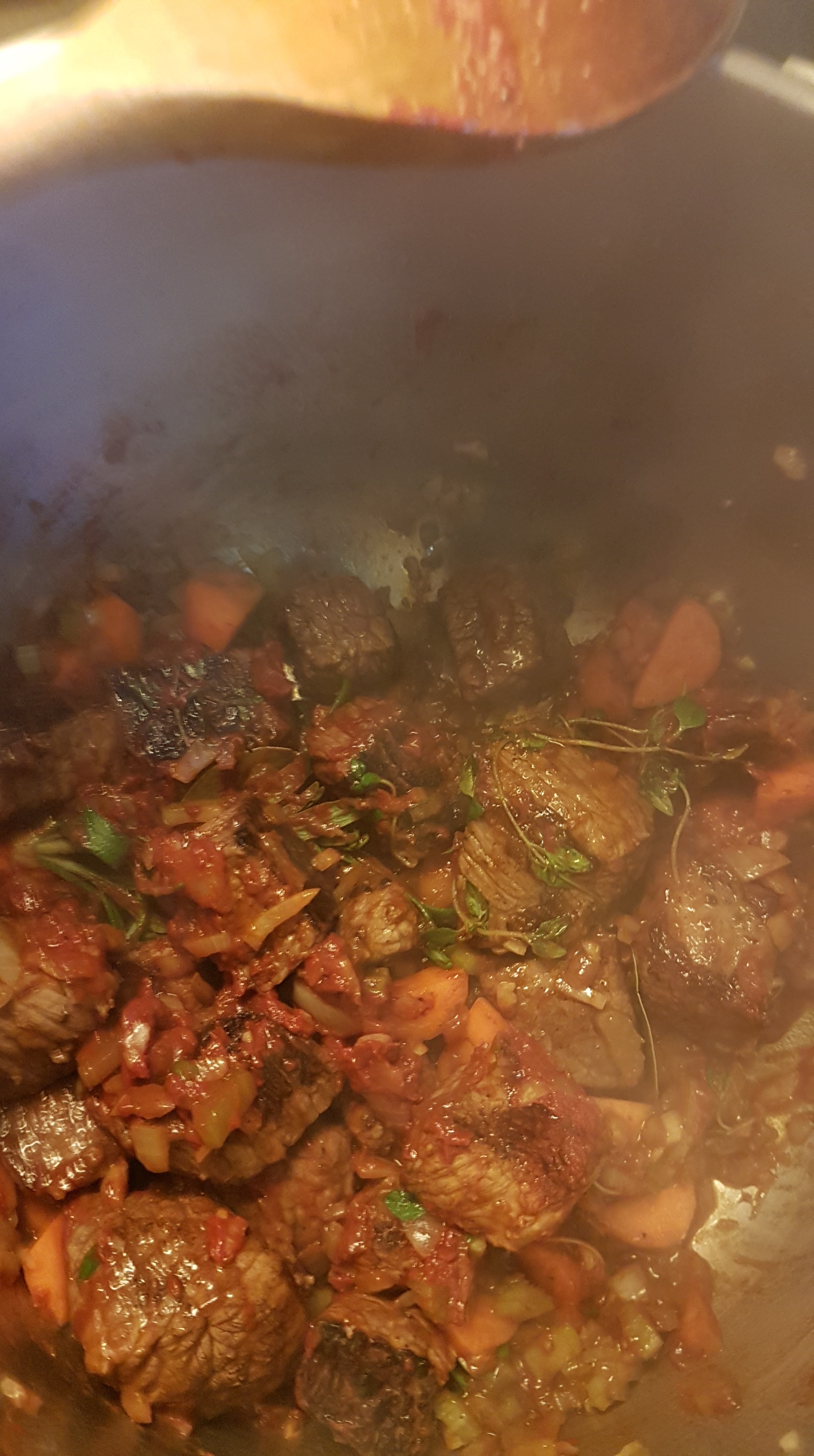 20171014_162529 16/10/2017 at 2256 × 4032 in Simremad med øl, og så i en fart Forrige Næste Da kødet var brunet godt af, røg det over i trykkogeren sammen med rosmarin, timian, laurbærblade og tomatpuré.
