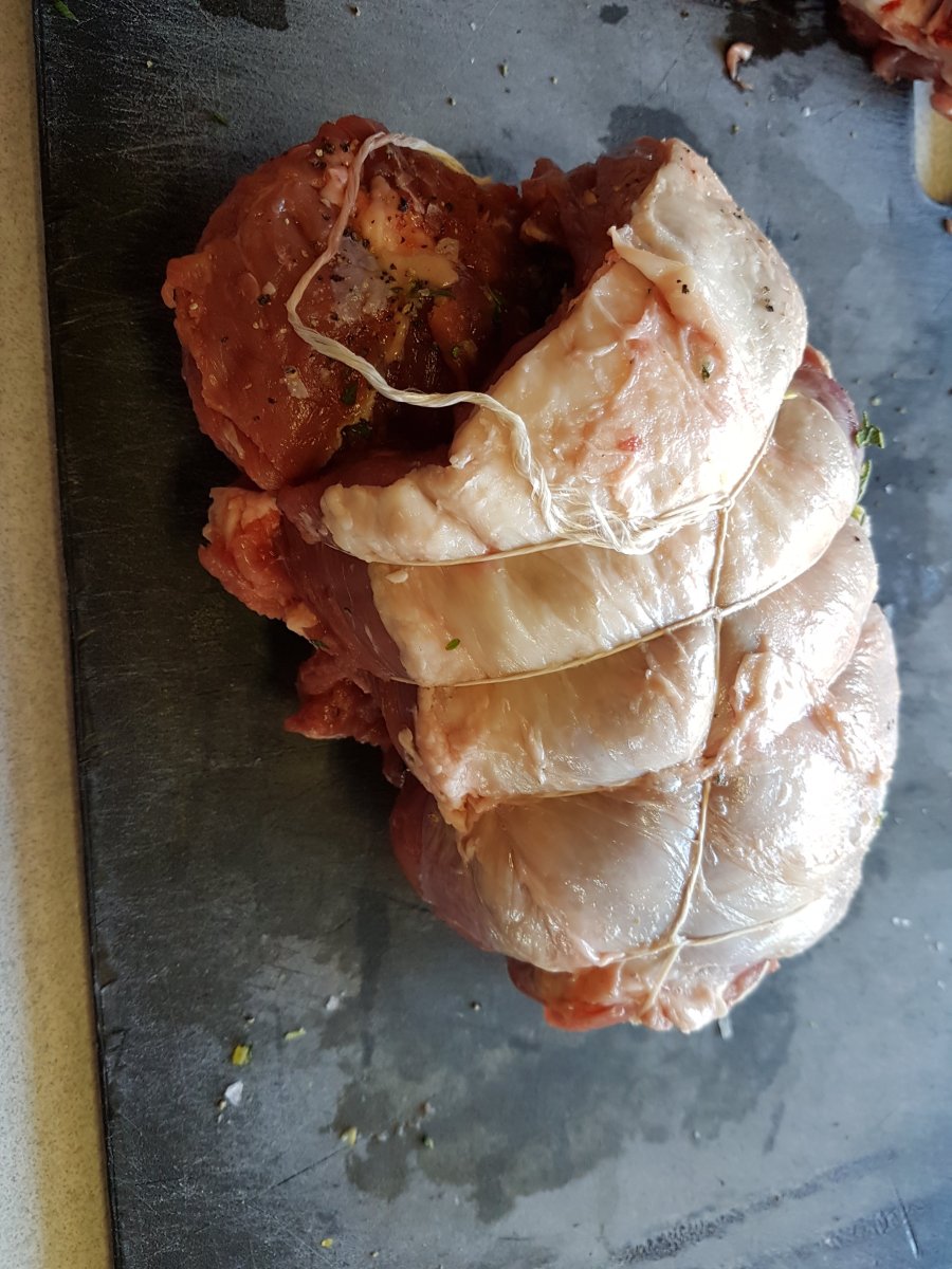 20180330_111045224219201.jpg 30/03/2018 at 3024 × 4032 Krydderurter, citron og hvidløg blev sammen med salt og peber lagt på kødet og dernæst blev kødet rullet og bundet op med snor