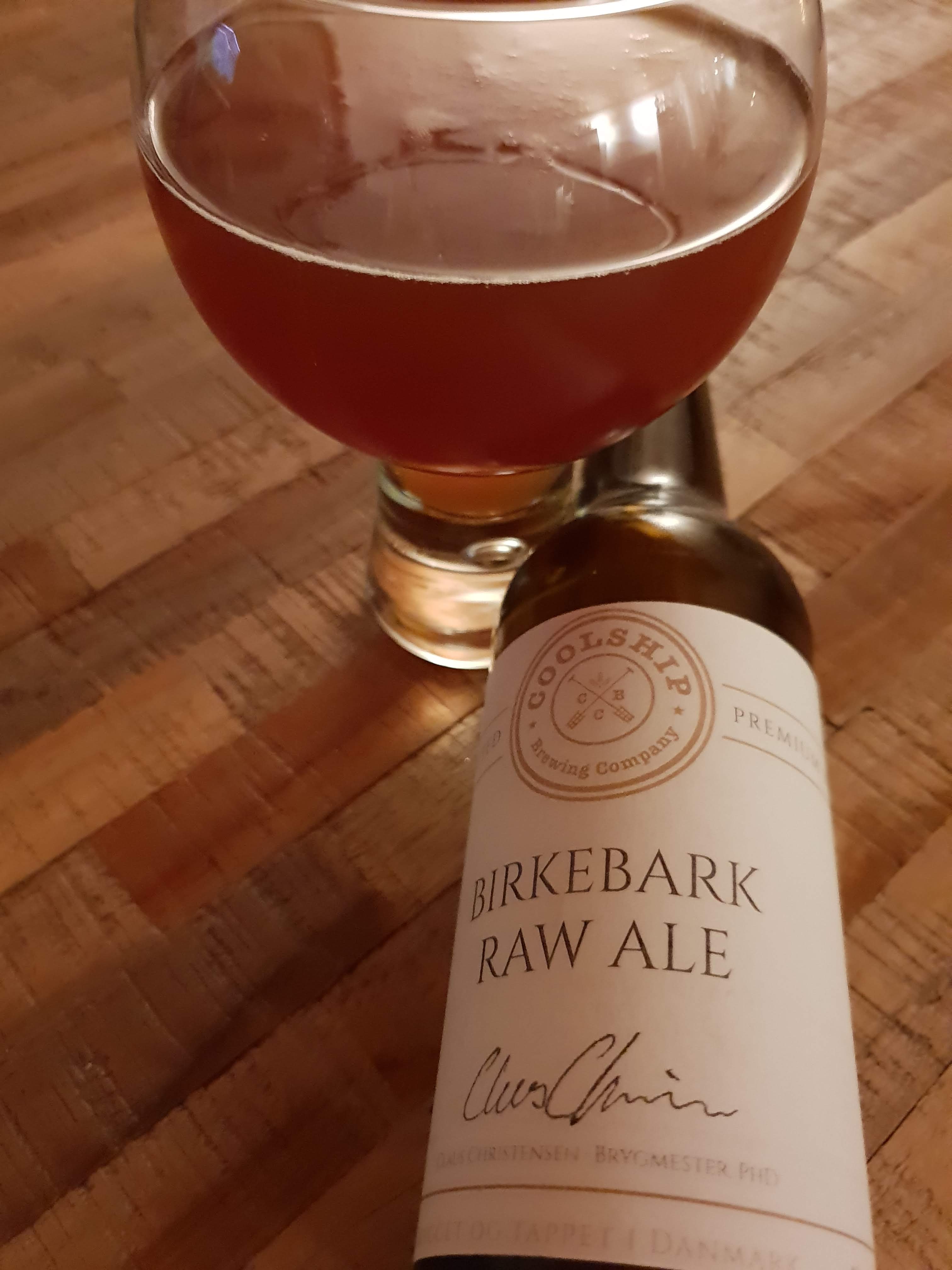 Jeg har et stykke tid haft dårlig samvittighed over for Claus Christensen fra Munkebo og Coolship. Han forærede mig for længe siden et par flasker af den øl, Birkebark Raw Ale, som han har lavet på det fynske museum ved Ladby. Du kan læse mere om selve processen her, men kort fortalt, så er øllet brygget i en udhulet træstamme, hvor opvarmningen er sket ved hjælp af varme sten. Der er, som navnet mere end antyder, benyttet birkebark i forbindelse med filtrering, men der er også tilsat enebær og malut. Øllet er ikke, som man ellers gør med moderne øl, blevet kogt, inden det er sat til gæring. Der er heller ikke tilsat humle til brygget. Deraf betegnelsen raw ale, da vi har med den rå urt at gøre.
