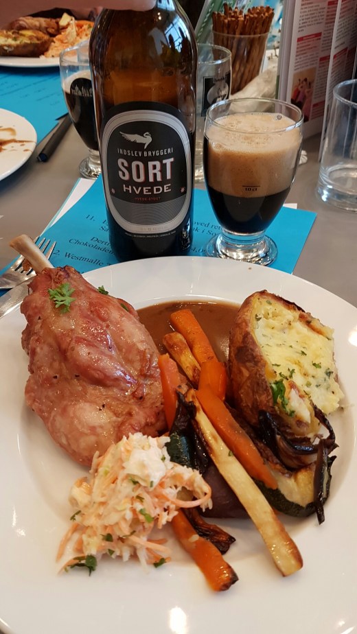 Menuen bestod af svineskank marineret i 48 timer i Sort Hvede, serveret med dobbeltbafte kartofler, rodfrugter, sauce og en coleslaw. Det var lige hvad kroppen havde brug for. Desserten vidt i øvrigt chokolademousse med Samiclaus i og til. Også ganske glimrende