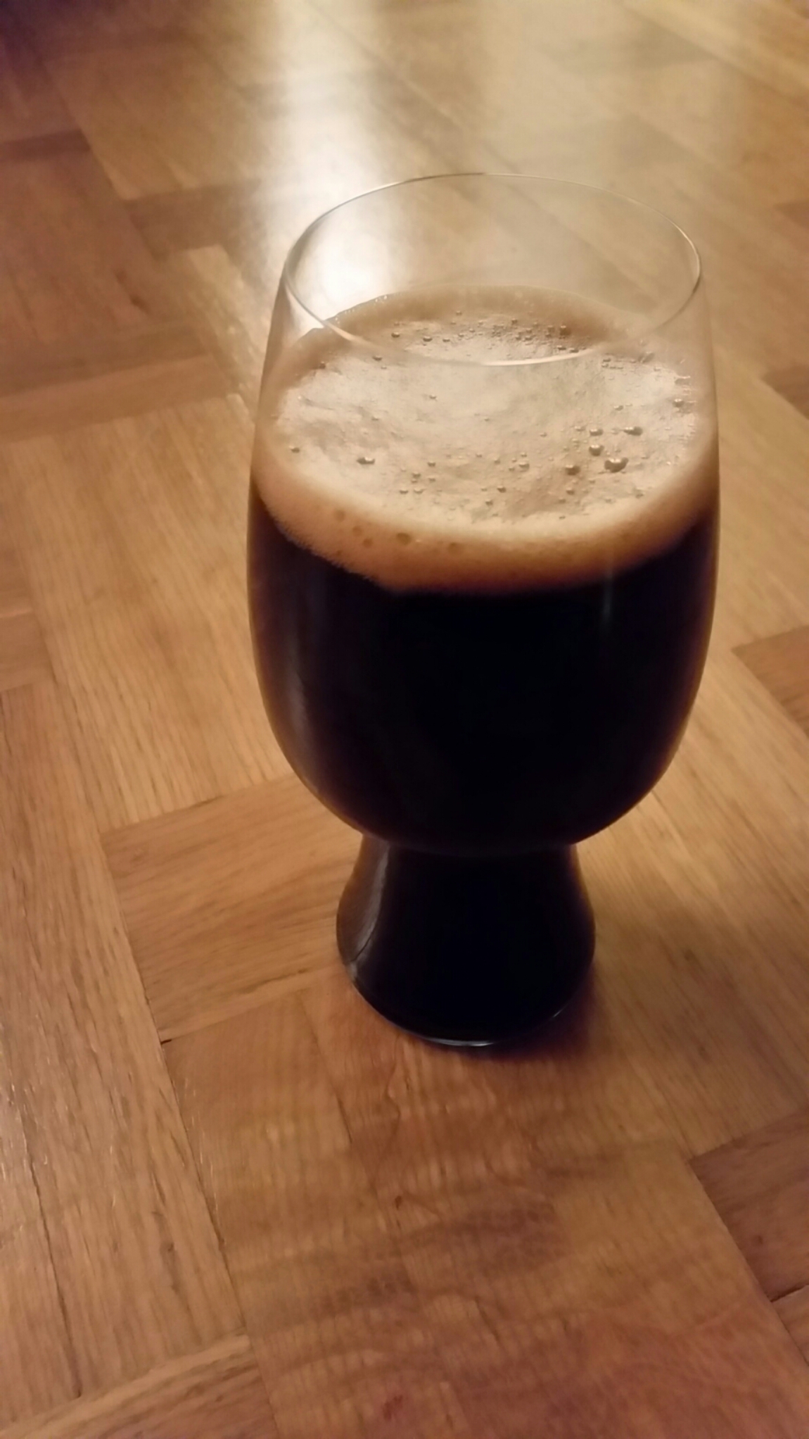 Jeg valgte, at skænke øllet i mit relativt nyindkøbte stoutglas og det tog sig da også smukt ud i glasset. Kulsort med et kraftigt lysebrunt skum, der dog hurtigt og knitrende faldt sammen og blev liggende som et tyndt lag i ret lang tid, inden det helt forsvandt, men skumkrone er heller ikke let på så stærk en øl.