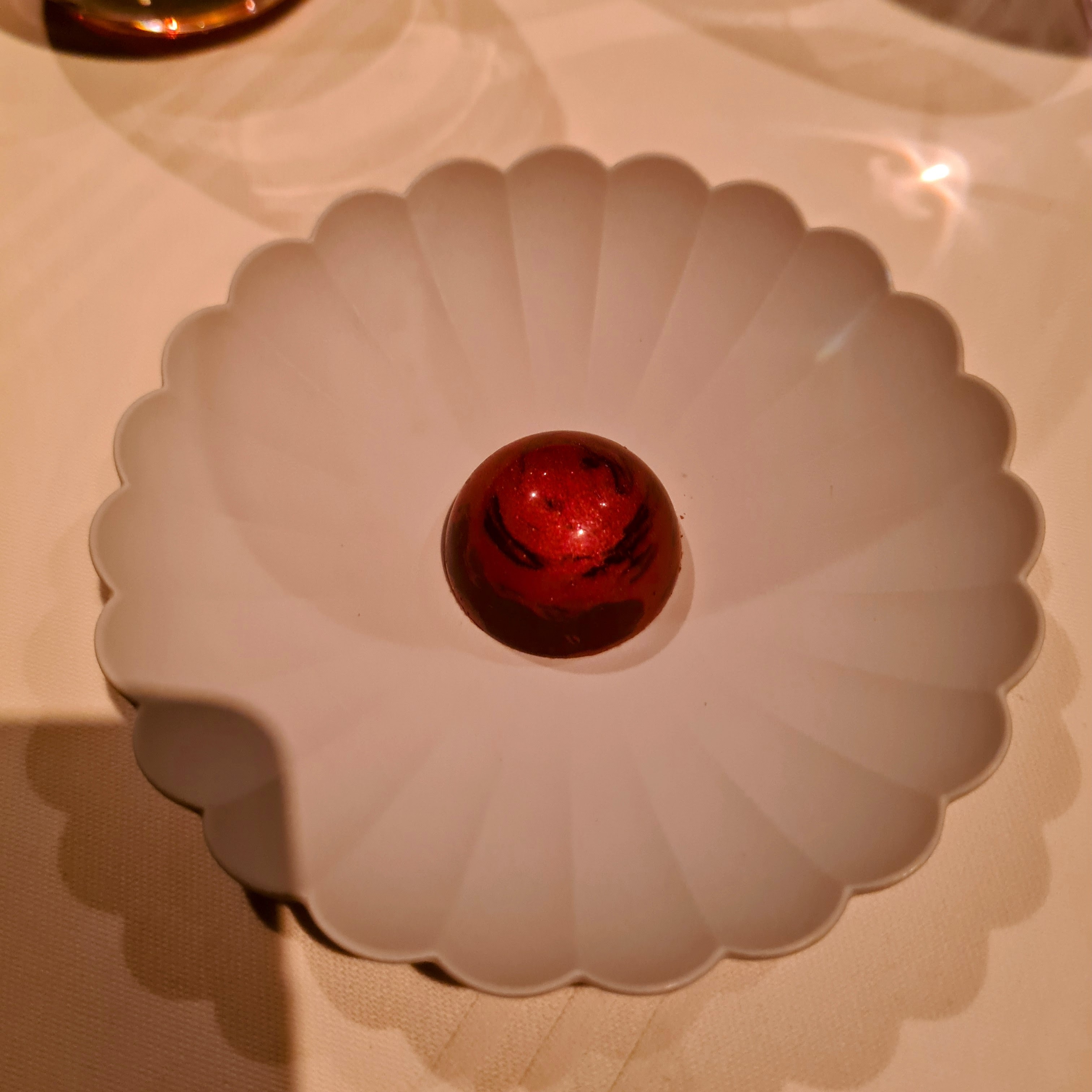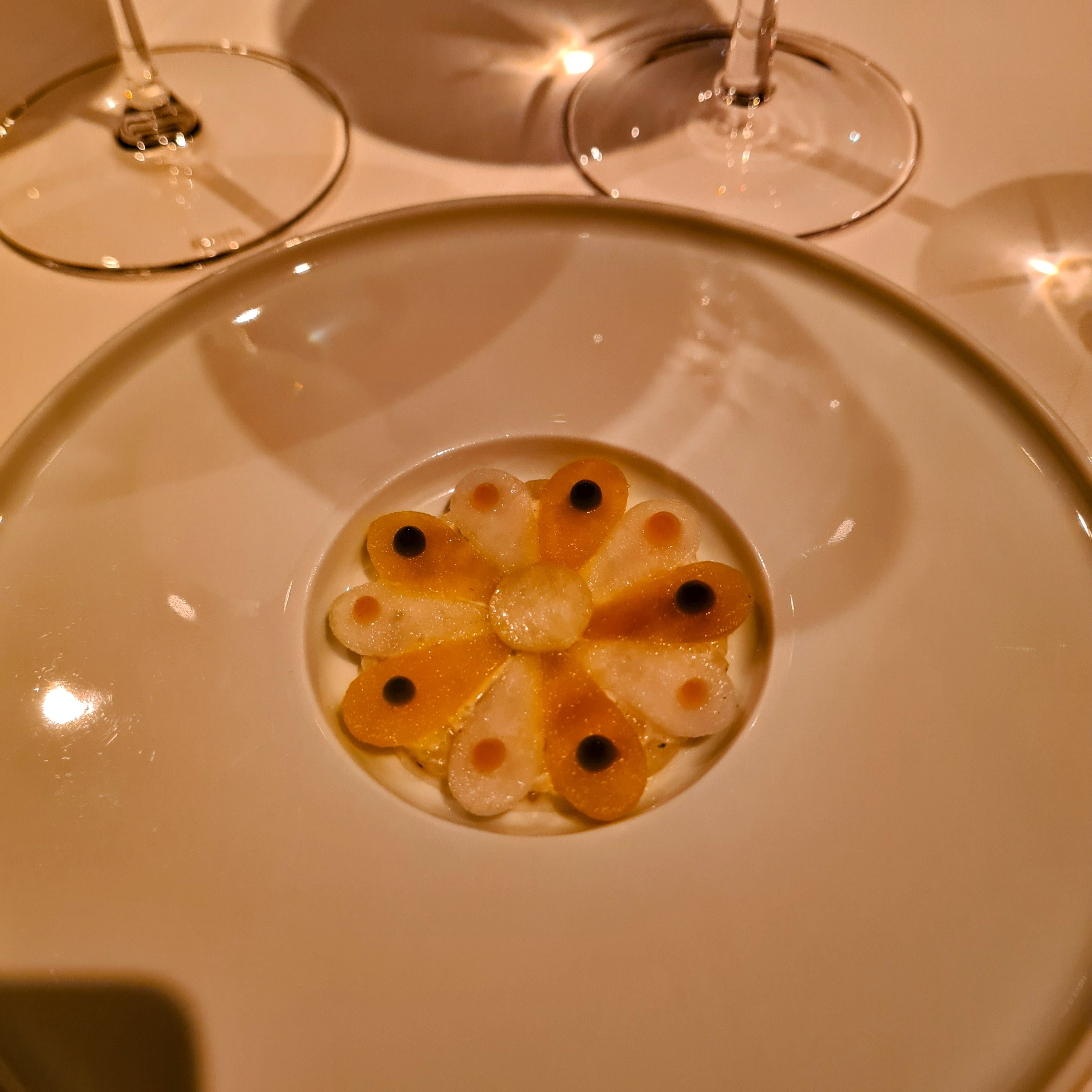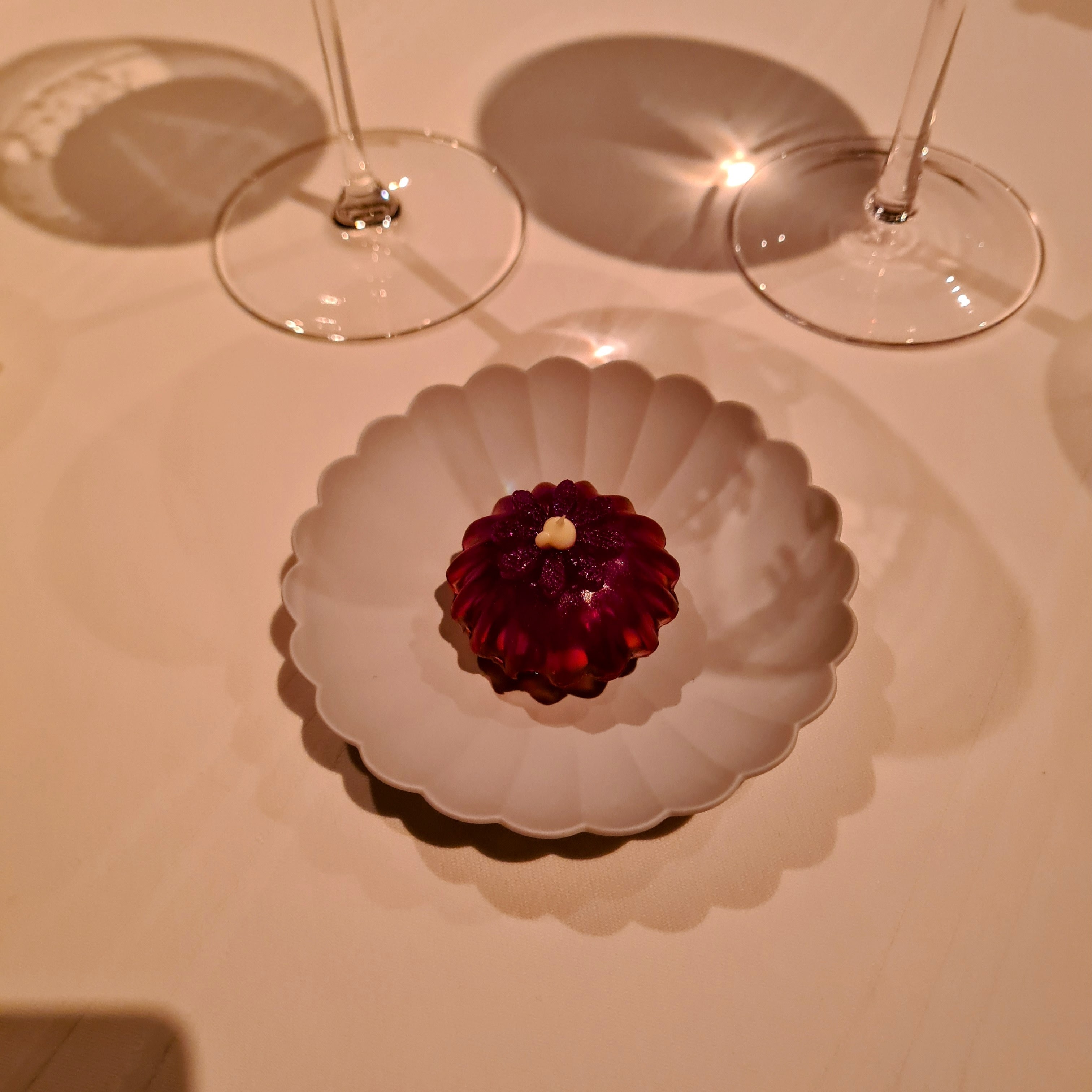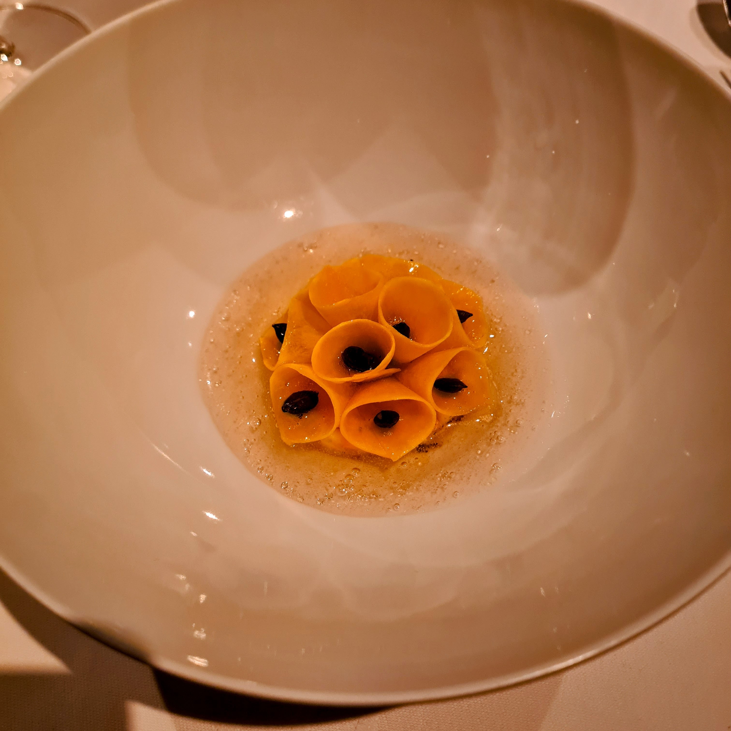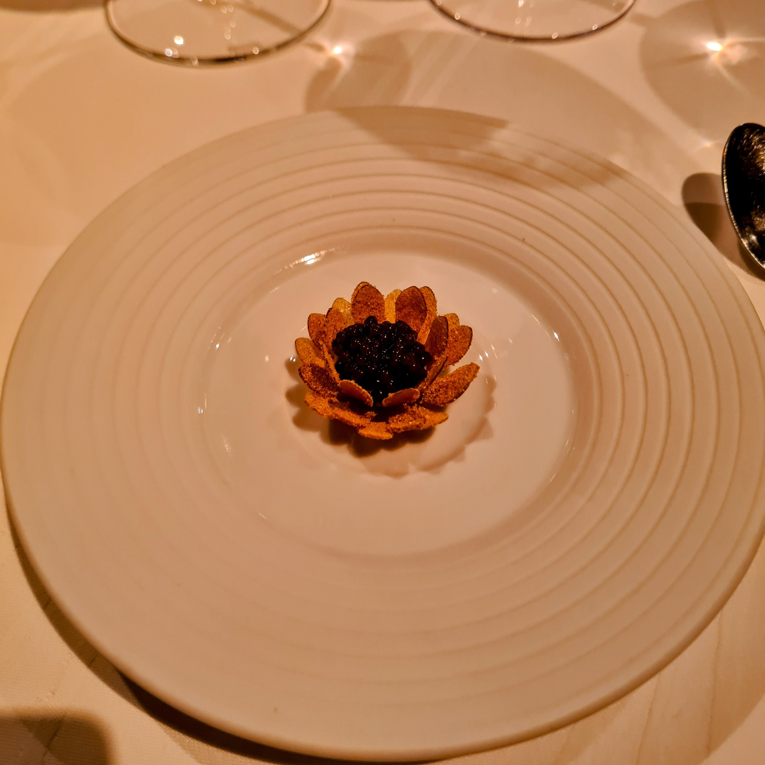 Alle de tre snacks var, som resten af maden i øvrigt, rigtig fremragende, og bestod af sprød blomst af jordskokker og kaviar, salat af kammusling med sylt og hummertærte med hindbær og hybenrose. Det lyder måske simpelt, men som man nok kan se, så var det ikke sådan.
