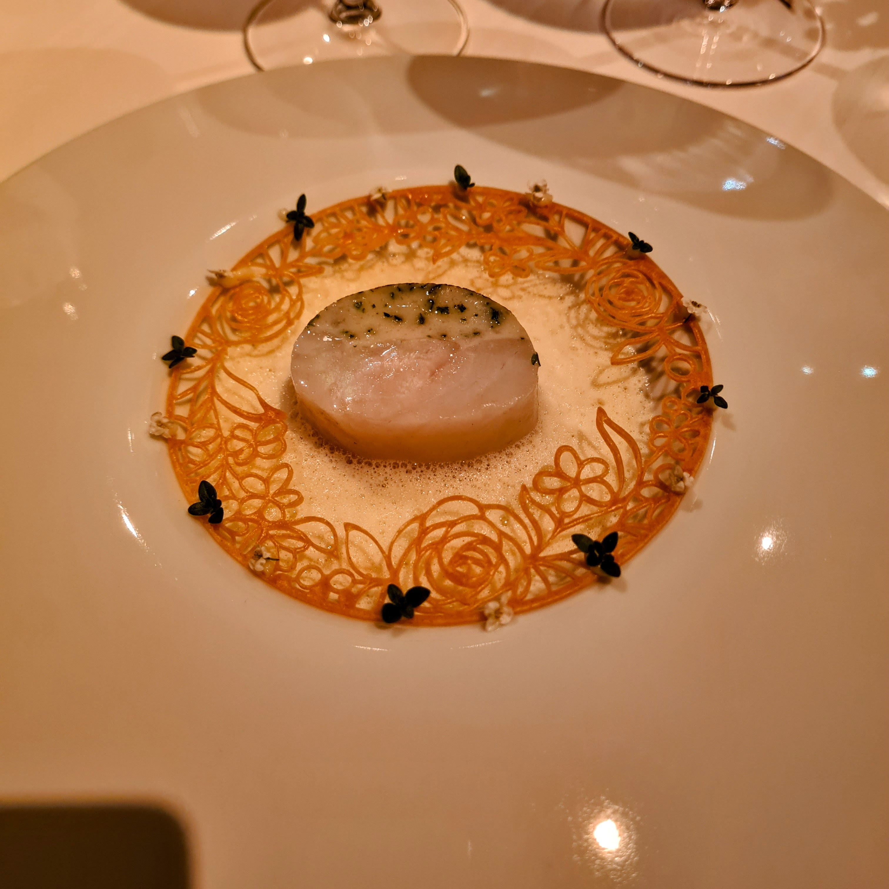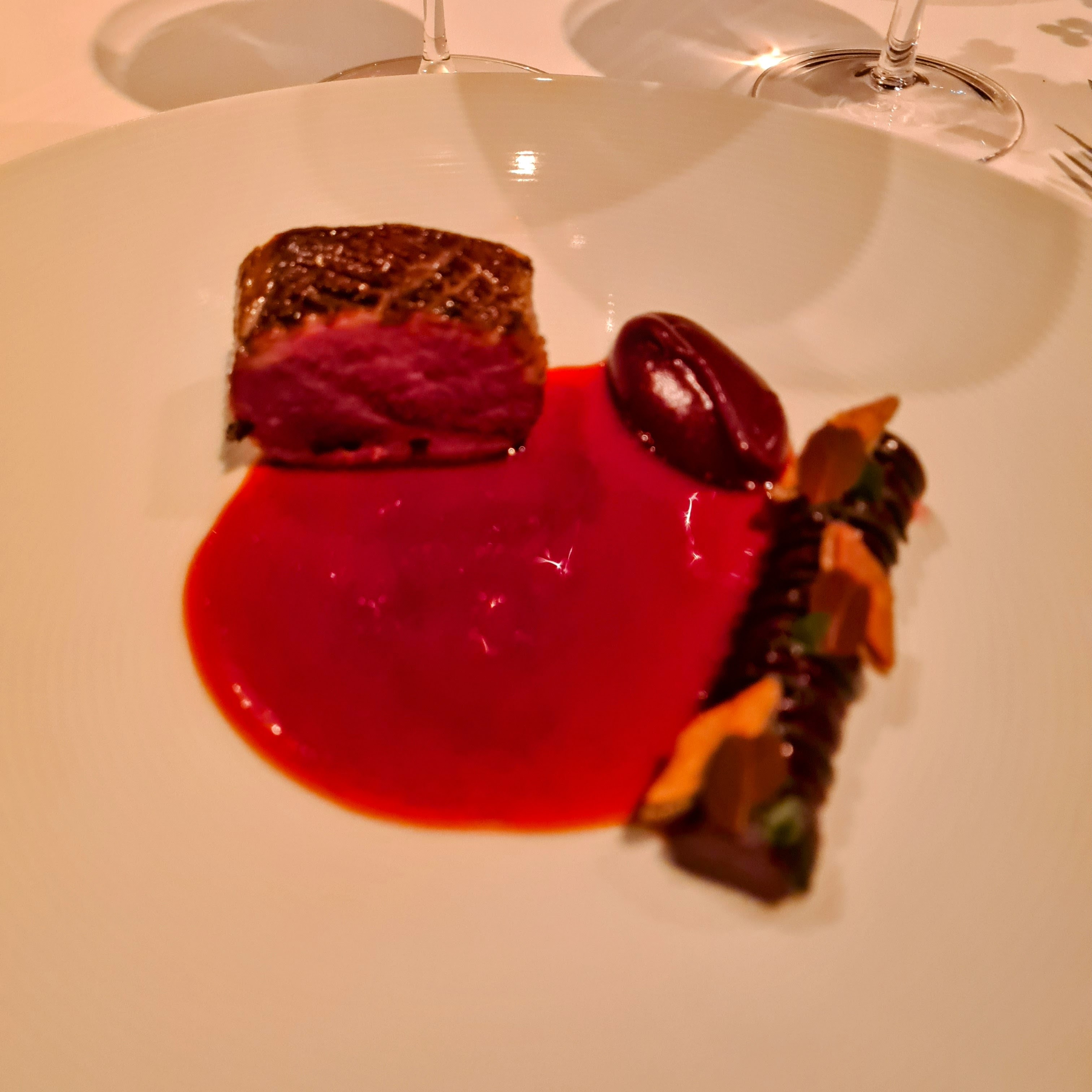 Næste ret var anden gang vi stødte på den lokale sorthummer fra Trelde Næs, som i først emøde hace bær og hybenrose fra samme sted, så havde den i anden ombæring fået selskab af bl.a. forårsløg i en sfogliatella af kartofler og en sauce valle fra Havgus fra Arla Unika og løvstikke, og så lige en fin lille skefuld god kaviar på toppen. Dertil havde Lasse valgt Lobotomy fra Bad Seed, som have fin balance med lidt koriander og lime til de fine smage. Det var, som resten af aftenen ret godt arbejde fra en mand, der klart var mest på hjemmebane med vin, men som delte sine overvejelser og valg med os, men som også spurgte interesseret ind og bad om kritik. Det fungerede fint, for vi følte os tage seriøst og det gjorde det både lærerigt, men også hyggeligt og uformelt.