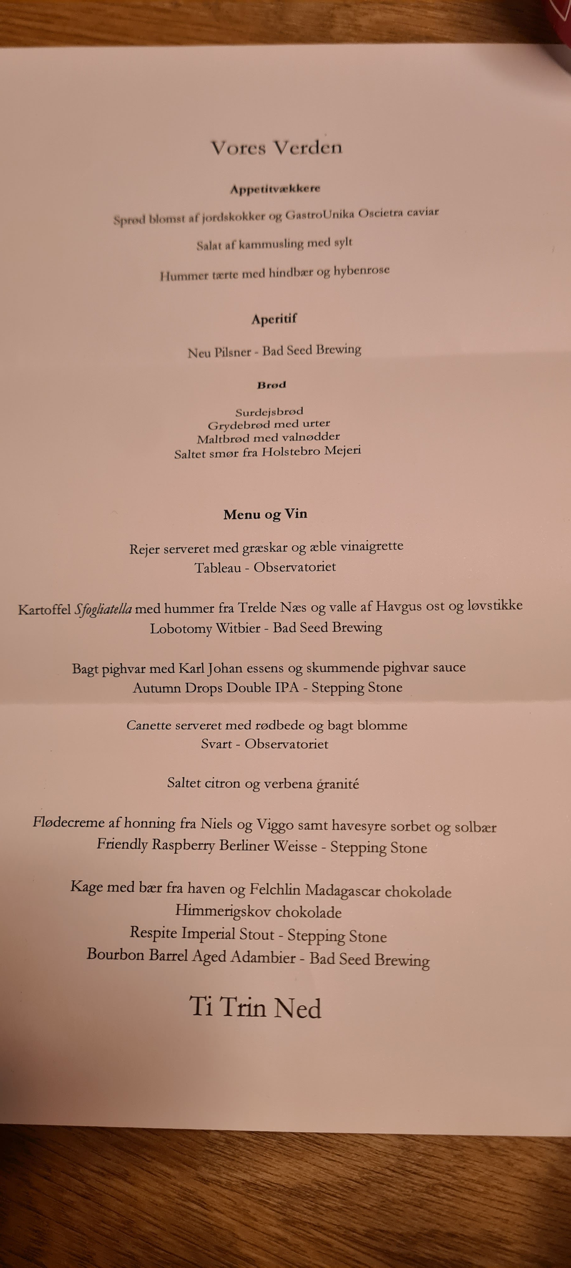 Min bedre halvdel og jeg har i længere tid gerne villet besøge Ti trin Ned, men det er bare aldrig rigtig blevet til noget, men da Daniel True fra Stepping Stone havde fået overtalt restaurantens sommelier til at teste en ølmenu til at matche den store oplevelse, som hos Ti Trin Ned kaldes Vores Verden, og tilmed til en på dagen særlig pris, så besluttede jeg, at jeg gerne ville invitere Lene-Christina ud, og da min gode ven og podcastmakker Niels Kristian og hans bedre halvdel Christina gerne ville tage turen fra Silkeborg til Fredericia, så blev det til en udflugt for podcastværter og hustruer, og det var slet ikke så ringe endda. Faktisk meget langt fra.
