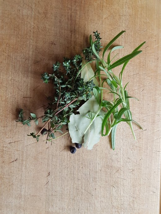 Jeg lagde ud med at finde lidt krydderurter og krydderier. Køkkenet kunne byde på timian, rosmarin, laurbær og enebær. Jeg smed det hele i bunden af en stor bradepande. Jeg synes, at både timian og rosmarin går glimrende til mad, der skal hygge sig i mange timer, men du vælger bare det du helst vil have.