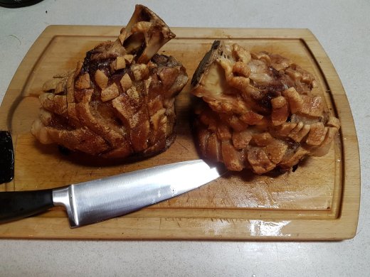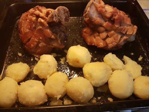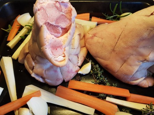 Der er nu noget smukt over et stykke kød, eller rettere to, med sprød svær hele vejen rundt. Benene var lige til at trække ud og man kunne, hvis man ønskede det, fint bruge kødet til pulled pork.