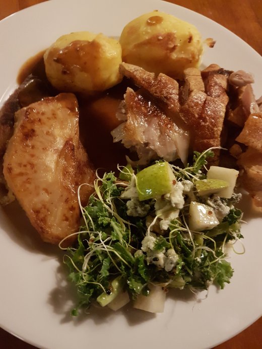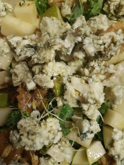 For at det hele ikke skulle blive alt for tungt og brunt, så lavede jeg en lille salat til retten. Jeg havde en pose skyllet og klargjort grønkål, som jeg gav følgeskab af en pære, lidt løgspirer, valnødder og en Mammenblu fra Mammen Ost i Bjerringbro. Det hele blev vendt i en dressing af olivenolie, æblecidereddike, grov sennep, honning, salt og peber.