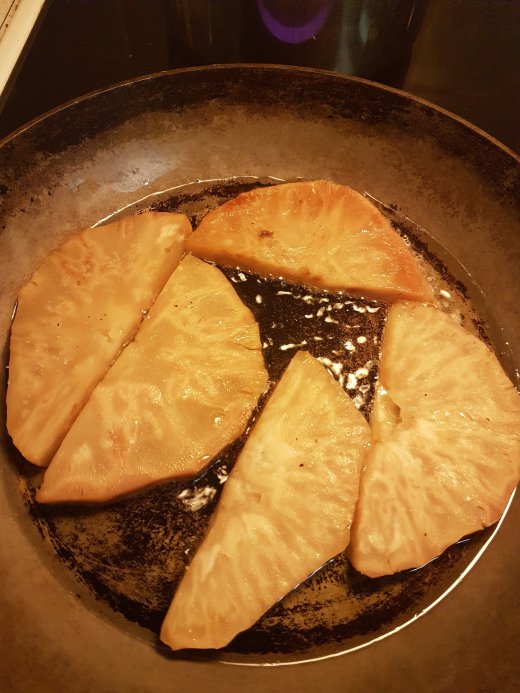 Ca. 45 minutter inden servering tog jeg sellerien ud af ovnen og lod den hvile lidt. Derefter skar jeg den i ca. en cm tykke skiver, som blev stegt i smør.