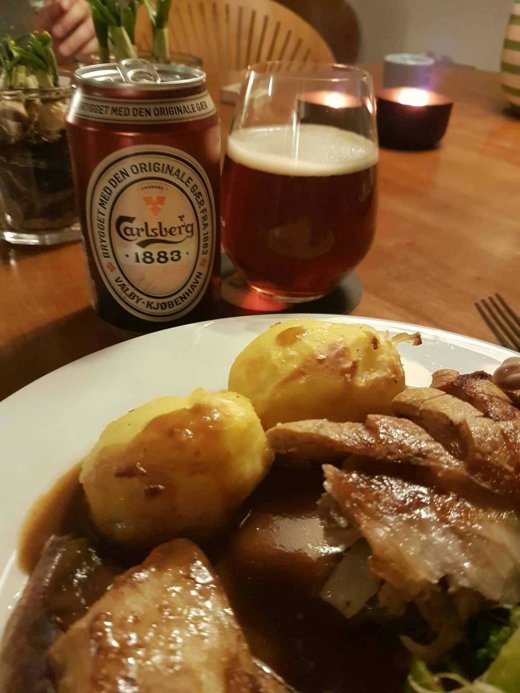 Jeg valgte at servere samme øl, som også var i maden. Det fungerede faktisk ret godt, da malten og kulsyren klarede både fedt og salt helt fint. Man kunne også sagtens have valgt en noget stærkere øl, hvor alkoholen også havde spillet en rolle. En mere frisk og bitter øl, som en ipa eller pale ale havde nok også klaret jobbet.